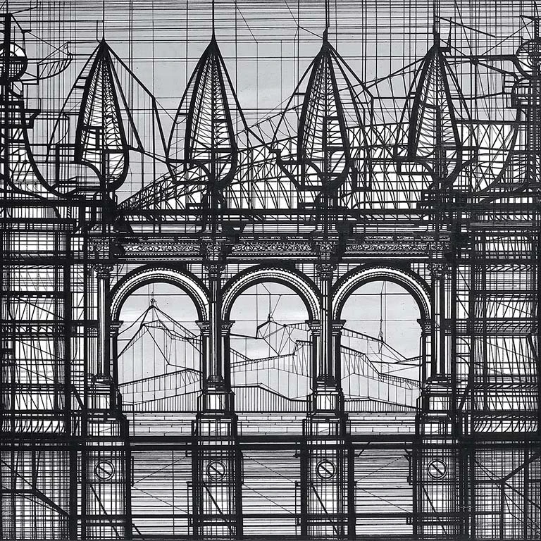 Центральным вау-элементом экспозиции стала масштабная трехметровая арка, сплетенная из тонких металлических прутьев — своеобразный портал, сквозь который зритель физически может пройти. Специально для выставки Чумак создал не только крупноформатную графику, но и временную тотальную инсталляцию, лично расписав стены одного из залов музея. «МЕТАПОЛИС» — это идеальная локация для тех, кто хочет отвлечься от московской суеты и поразмышлять о том, куда движется наша цивилизация, созерцая безупречную эстетику линий и форм.