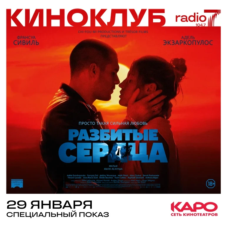 Мы вместе с сетью кинотеатров КАРО приглашаем вас 29 января в кинотеатр «КАРО 7 Атриум» на специальный показ фильма «Разбитые сердца» - французская драма режиссёра Жиля Леллуша, основанная на романе ирландского писателя Невилла Томпсона «Джеки любит Джонсера, о’кей?».