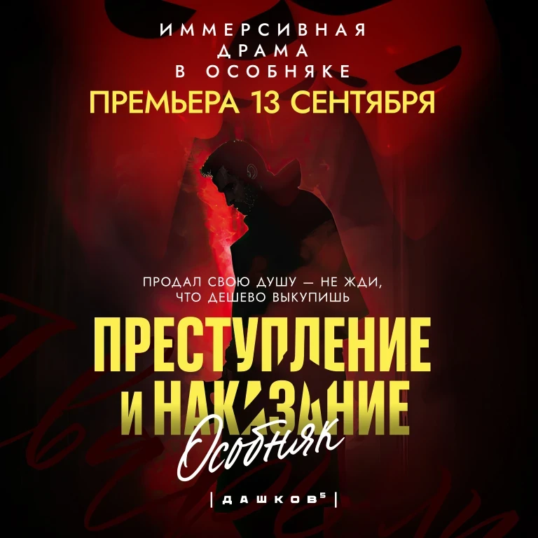 13 сентября в Москве состоится премьера иммерсивной драмы «Преступление и наказание» по мотивам одноимённого произведения Ф.М. Достоевского. Трагическое действие постановки развернется в самом сердце Москвы – в особняке «Дашков 5».