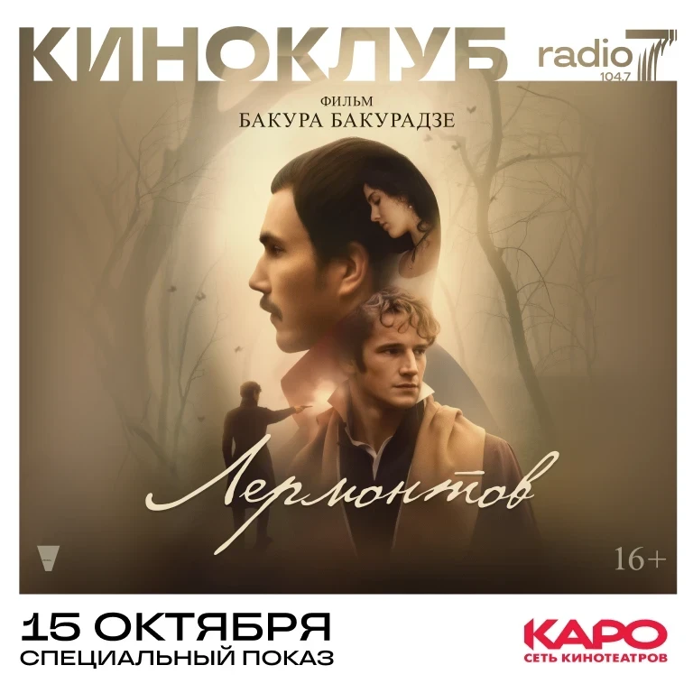 Мы вместе с сетью кинотеатров КАРО приглашаем вас 15 октября в кинотеатр «КАРО 7 Атриум» на специальный показ фильма «Лермонтов» — картина о последнем дне жизни великого поэта, трагически погибшего на дуэли 15 июля 1841 года.