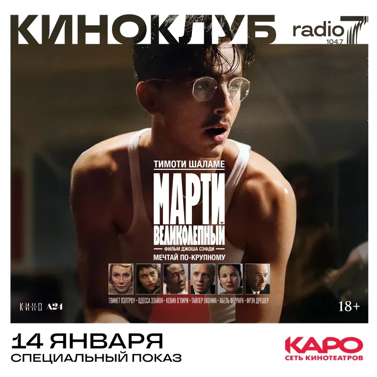 Мы вместе с сетью кинотеатров КАРО приглашаем вас 14 января в кинотеатр «КАРО 11 Октябрь» на специальный показ фильма «Марти великолепный» — комедийная драма с Тимоти Шаламе в главной роли.