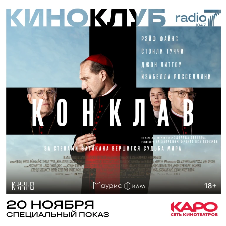 Мы вместе с сетью кинотеатров КАРО приглашаем вас 20 ноября в кинотеатр «КАРО 11 Октябрь» на специальный показ фильма «Конклав» - триллер о тёмных тайнах Ватикана со Стэнли Туччи и Рэйфом Файнсом в главных ролях.