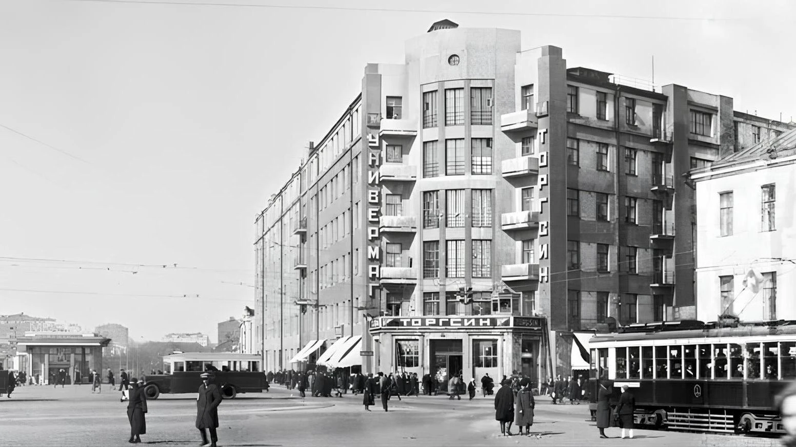 В 1928 году здание строили по проекту архитектора В. Олтаржевского, а перестраивал уже В. Маят: он надстроил 6-й этаж, сделал башню гранёной и поднял её на всю высоту прежнего аттика. По торцам пилонов и над входным вестибюлем были высечены крупные рубленые надписи «Универмаг Торгсин».
